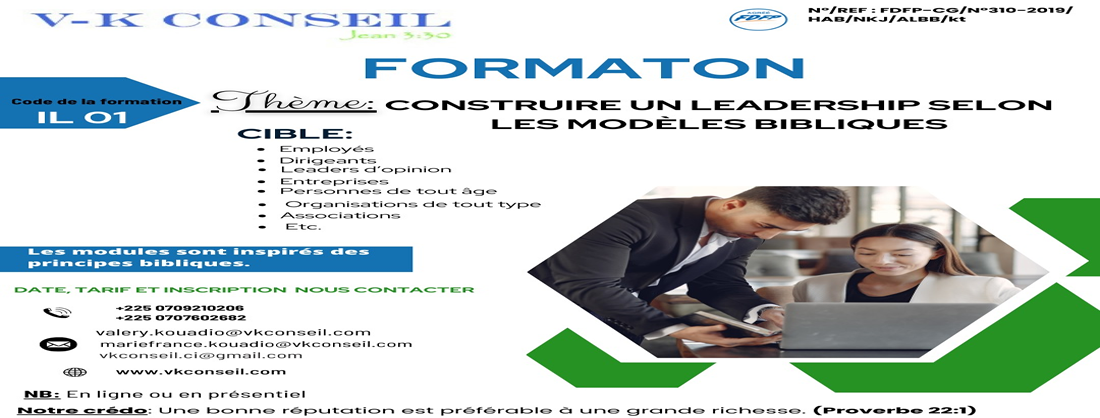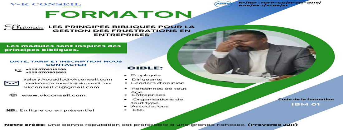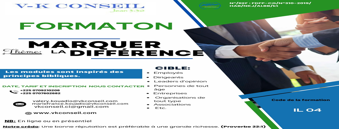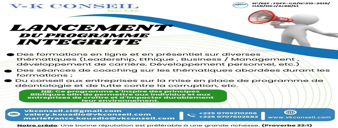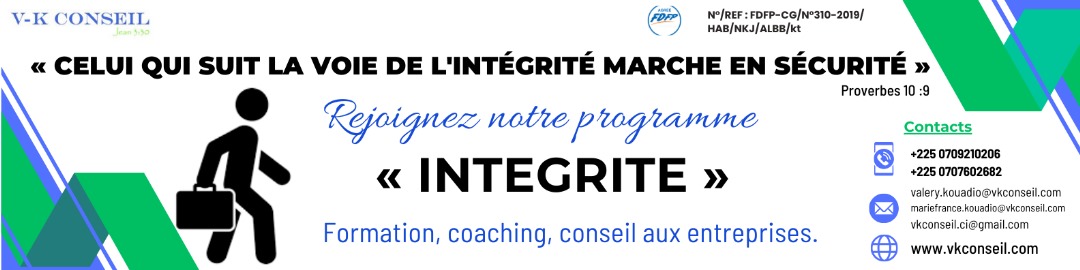 Créée en 2017, notre entreprise dénommée VALERY KOUADIO-CONSEIL (V-K CONSEIL) est une SARL spécialisée dans le Conseil, la Formation et l’audit Organisationnel. Elle est dirigée par M. KOUADIO Valery qui bénéficie d'une solide expérience en matière d'organisation d'entreprises, de conduite et de certification de projets Qualité-Sécurité-Environnement.